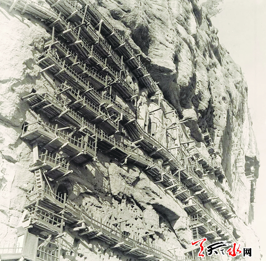据了解,麦积山石窟在历史上一直是传统的木质栈道,上世纪四十年代之前,由于香火败落,长期失于修缮,石窟栈道多数断绝无法通行,仅东崖的中七佛阁和上七佛阁可以通达,其他位置都是只能远观而不能进入洞窟,包括最初调查麦积山石窟的冯国瑞先生也只能无奈远望。