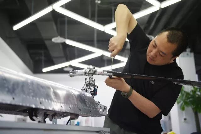 △2017年5月4日,“动批”天皓成服装批发市场改建成的“宝蓝金融创新中心”内,一位员工调试无人机。