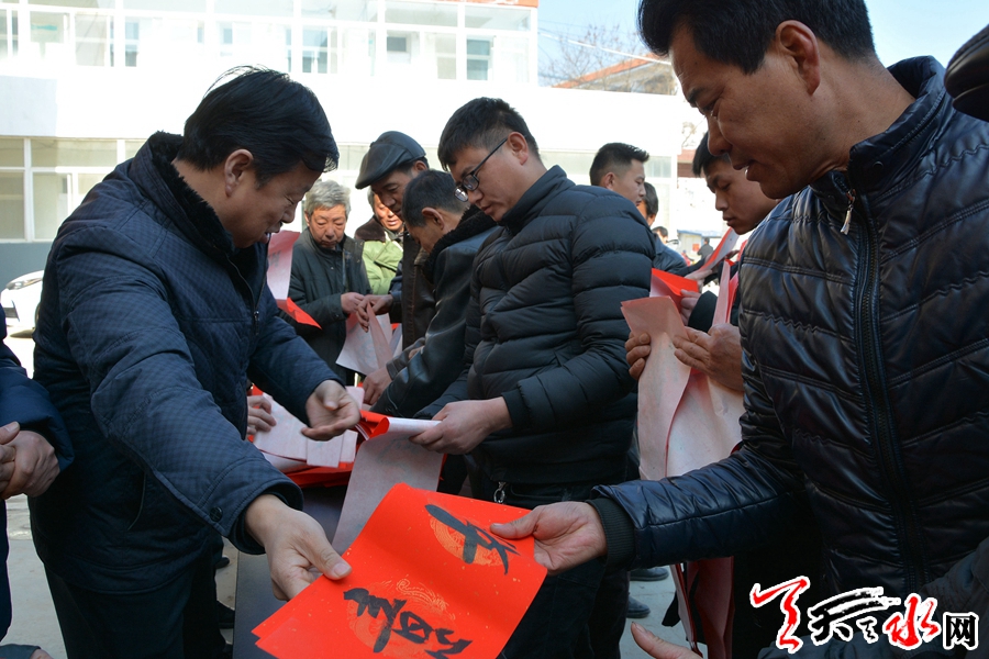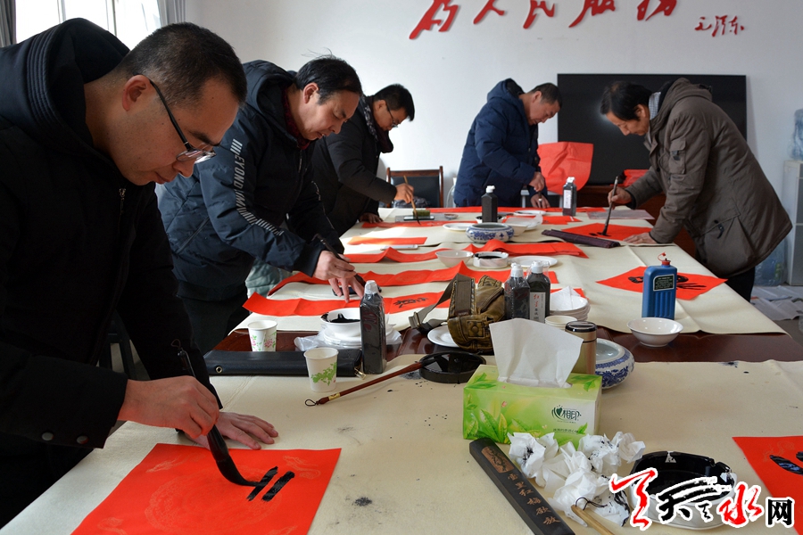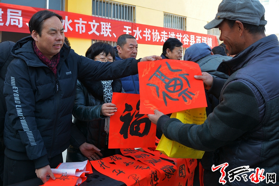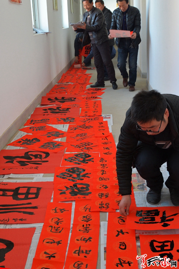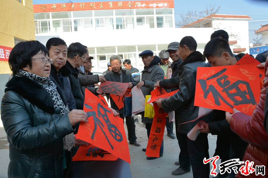 1月23日,天水市住建局、市文联、市书法家协会组织我市知名书法家走进甘谷县西坪镇,开展“我的中国梦”文化进万家活动,为当地群众送出春联300余副,“福”字100余个,受到当地群众的热情欢迎。全媒体记者 童强 摄