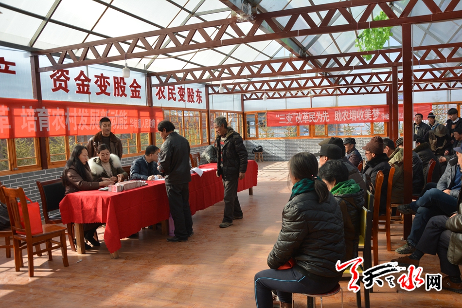 天天天水网讯【记者王军祥 张彬霞】 “推进农村‘三变’改革 培育农村发展新动能”“‘三变’改革民为先助农增收奔小康”……1月23日,秦州区华岐镇汪团村“三变”改革分红大会在村上甘肃保源农林科技有限责任公司举行。分红大会现场,关于“三变”改革政策的横幅引人注目,听说要发分红金,村民们冒着严寒来到现场领取土地“变”出来的红利。