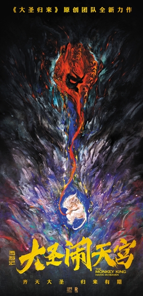 从目前片方公布的先导海报中,五彩石中的“大圣”以石猴婴儿的形式呈现,象征着故事的起点。巧妙的是,将海报倒置,成长后的大圣蜷缩而卧,红色火焰如红袍披身,但镇压于“大圣”身周的万千佛掌,却颇具一种“终结”的意味。这样的双重设定不仅是对原有传统的突破,也预示着《大圣闹天宫》将会有一个全新的面貌展露于世。
