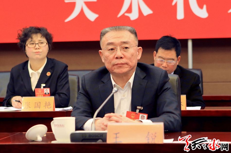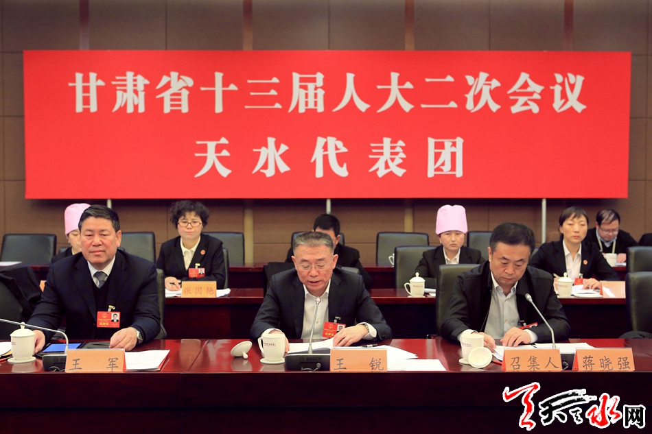 王锐在讲话中强调,省十三届人大二次会议,是在深入学习贯彻习近平新时代中国特色社会主义思想和党的十九大精神的关键时期、全面建成小康社会进入关键之年召开的一次重要会议,大会将全面总结2018年工作、安排部署2019年任务,议程多、任务重,对于凝心聚力促进转型升级发展、加快建设幸福美好新甘肃意义重大。各位代表要进一步提高思想认识,高度自觉讲政治、识大体、顾大局,切实强化代表意识、责任意识、使命意识,依法履行代表职责,正确行使民主权利,以认真负责的态度完成好大会确定的各项任务。要认真审议各项报告,立足省情、市情和各自工作实际,紧扣统筹推进“五位一体”总体布局和协调推进“四个全面”战略布局,紧扣坚持新发展理念、推动高质量发展、供给侧结构性改革,紧扣群众关心关注的热点难点问题,牢牢扭住影响全省发展的关键点,发挥聪明才智,积极踊跃发言,提出真知灼见,切实把各项工作报告学习好、讨论好、审议好。要精心撰写建议议案,结合平时开展视察调研掌握的情况,重点围绕打赢脱贫攻坚战、推动绿色发展崛起、保障改善民生等方面,提出一些有针对性的高质量建议和议案,客观真实反映社情民意和我市发展中的好经验、好做法,当好人民群众和我市发展的“代言人”。要严格遵守大会纪律,严格落实中央八项规定及其实施细则精神和省、市实施办法,按时按点、聚精会神参加各项会议活动,以良好精神状态展示天水代表团的整体形象。