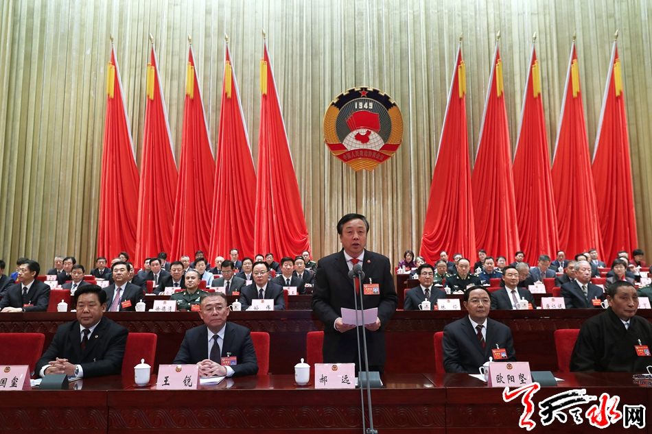 欧阳坚代表政协甘肃省第十二届委员会常务委员会作《政协甘肃省第十二届委员会常务委员会工作报告》,他从强化思想政治建设、坚持人民政协正确政治方向,践行新发展理念、围绕高质量发展和绿色发展协商议政,贯彻落实中央和省委部署、全方位全身心投入脱贫攻坚主战场,发挥重要渠道和专门协商机构作用、广泛凝聚改革发展正能量,以改革创新精神、务实有力加强政协自身建设五个方面,回顾总结了2018年的工作,指出各项工作有遵循、有内容、有载体、有效果,并取得了5条宝贵经验。