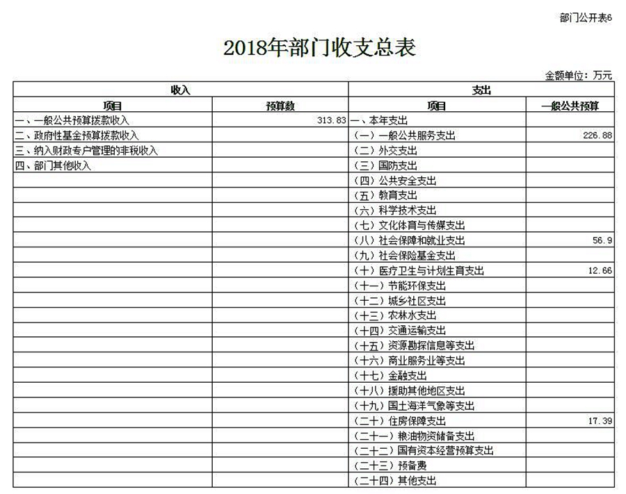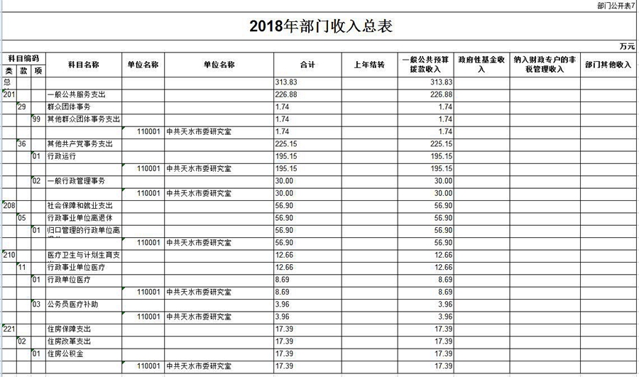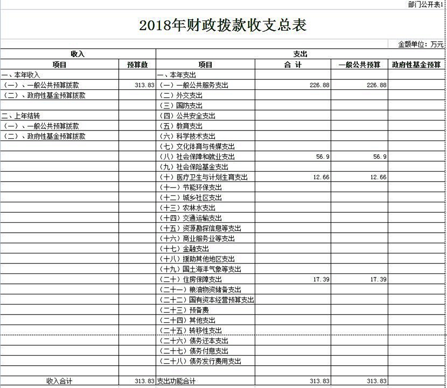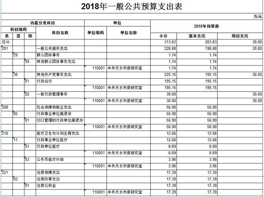 2018年市委研究室预算收入313.83万元,其中:一般公共预算财政拨款收入313.83万元,预算支出313.83万元。