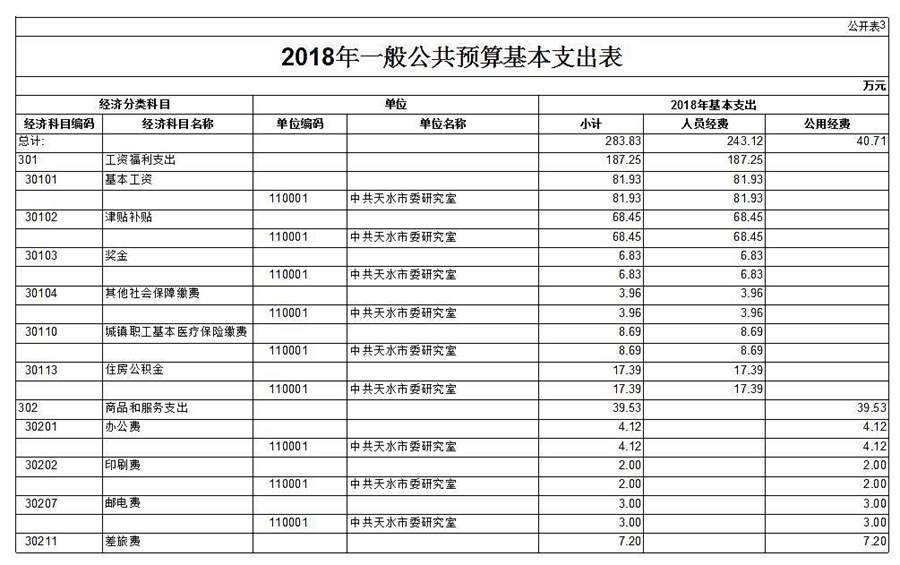 2018年市委研究室一般公共预算财政拨款基本支出283.83万元,与2017年294.49万元相比,减少10.66万元,减少3.62%。