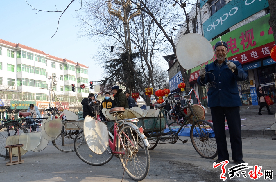 在集市的一角,几位旋鼓舞艺人制作的旋鼓成了非常热销的工艺品。他们“嘭嘭”地敲打着旋鼓,吸引了前来赶集的群众围观。旋鼓舞艺人销售的旋鼓有两种,鼓面直径小些的售价100多元,大些的售价200多元。