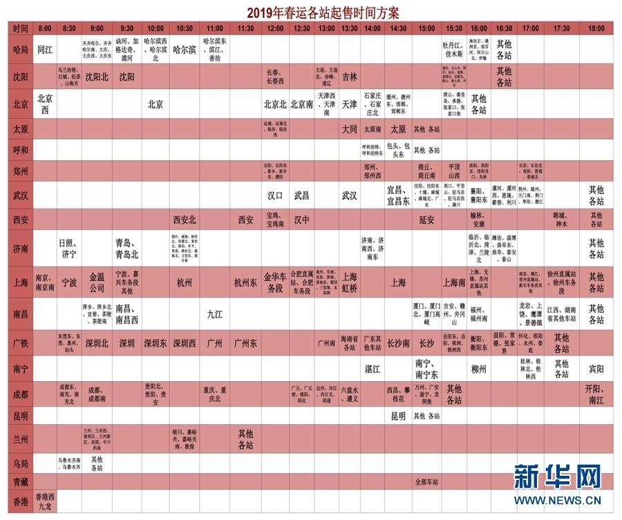 图为2019年春运各站起售时间分配方案。(12306供图)