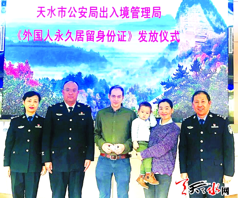 天天天水网讯【记者景春燕】1月28日下午,天水市公安局出入境管理局为英国人CHARLES颁发了“中华人民共和国外国人永久居留身份证”。这也是我市为外国人颁发的全市首张“中国绿卡”。