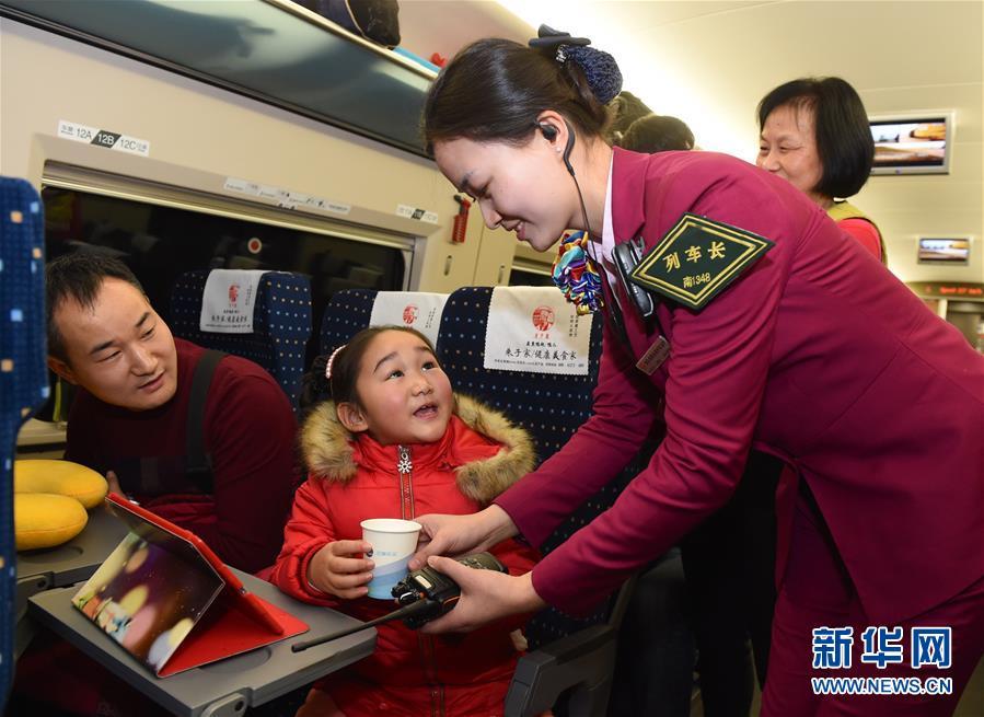 2016年2月6日,南昌铁路局福州客运段列车工作人员廖辉在春运的列车上为乘客送去热水。新华社记者姜克红 摄
