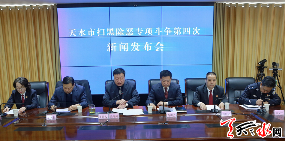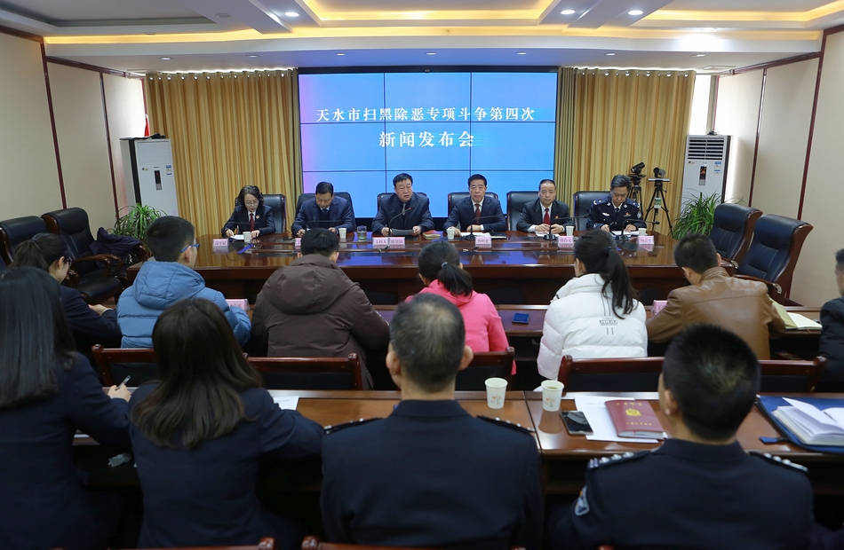天天天水网讯 2月1日上午,天水市召开扫黑除恶专项斗争第四次新闻发布会,面向社会发布全市扫黑除恶专项斗争开展情况。市扫黑办、市纪委监委、市委组织部、市中级法院、市检察院、市公安局等单位负责同志和甘肃法制报、天水电视台、天水日报社、天天天水网等媒体记者参加了新闻发布会。