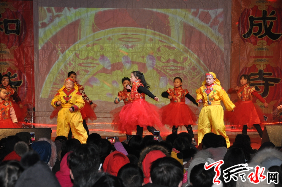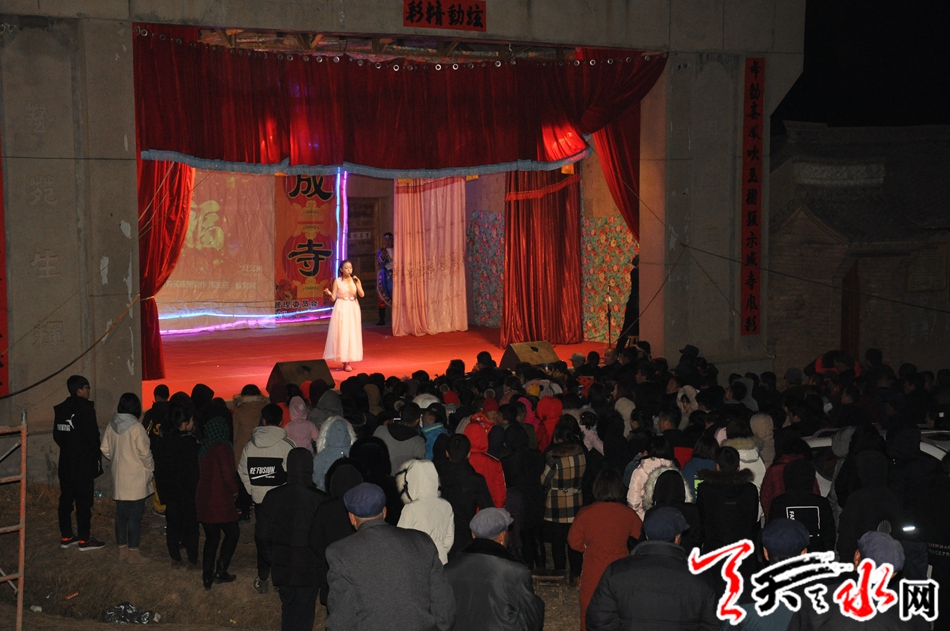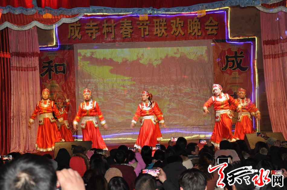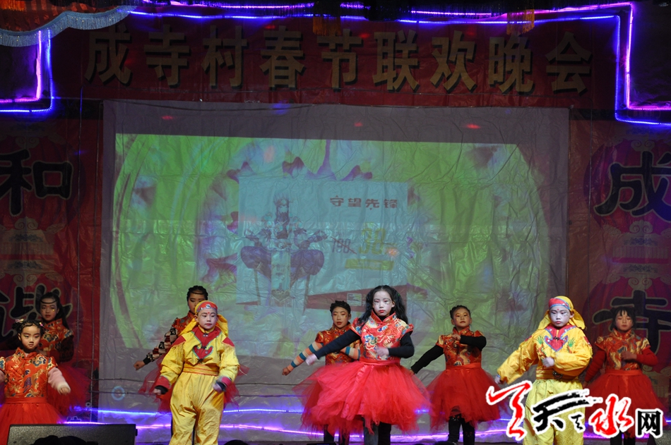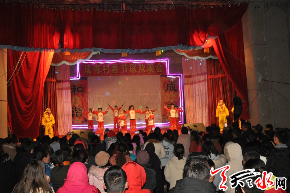 简陋的舞台、五彩的灯光、“手动式”的幕布、业余的主持人与演员……在热闹的新春氛围下和一声声爆竹声中,清水县王河镇成寺村的乡村晚会开锣了。今年已经是成寺村第四届“村晚”了,每年的大年初一到大年初四,每晚8时整,成寺村乡亲们都从家里走出来,聚集在村里的小舞台下,兴高采烈地期盼着看晚会,虽然整台晚会从设备到演员都不够专业,但却为乡亲们带去了实实在在的欢乐,也热闹了这个小乡村的新年。