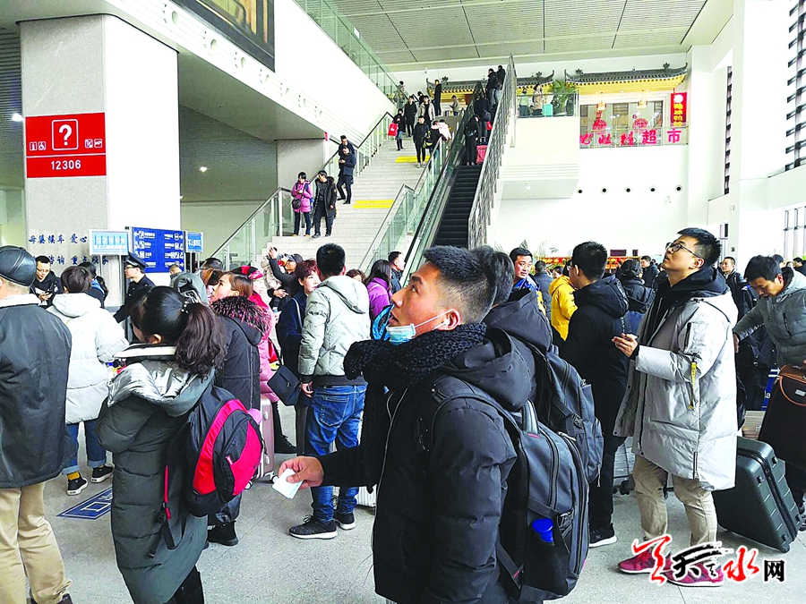 2月10日,春节过后,随着返程旅客的不断增加,天水南站迎来了返程高峰客流,春运返程高峰已经开始。车站工作人员提醒广大旅客朋友,乘车时尽量提早抵达车站。已通过互联网、电话成功预订车票但尚未取票的旅客,请尽量提前取票,旅客乘车时请携带车票及与票面信息一致的有效身份证件,一定要提前抵达车站,为安检、取票、验票进站等预留充足时间,以免耽误行程。