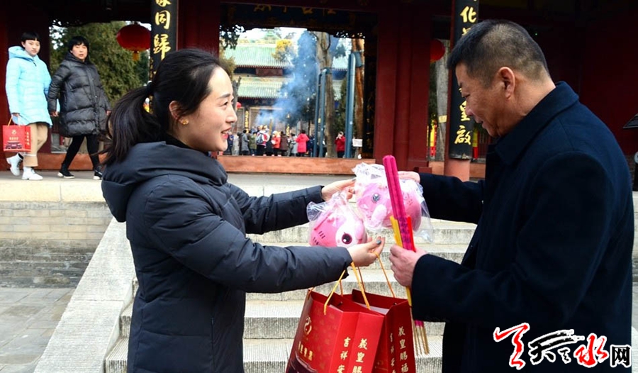 伏羲庙工作人员在新年第一天,为前100名游客送上伏羲庙吉祥物“龙娃”和“猪妮”。