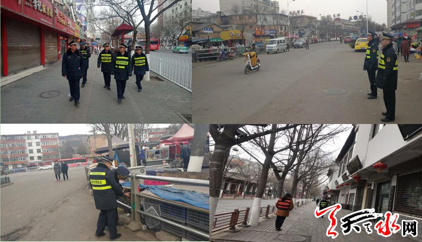 天天天水网讯 节假日和重大节庆活动是城市管理工作最为繁重的时间。今年春节长假期间,秦州城管以工作为重,不计个人得失,牺牲休息时间,集中执法力量,强化管理措施,扎实推进城市管理各项工作,以旅游景点、中心广场、主次干道为点,96条背街小巷为线,点线结合,全面细查排摸,细化措施,责任到人,集中整治城市“八乱”、全力管控违法建设,为广大游客和市民营造了整洁有序的城市环境。