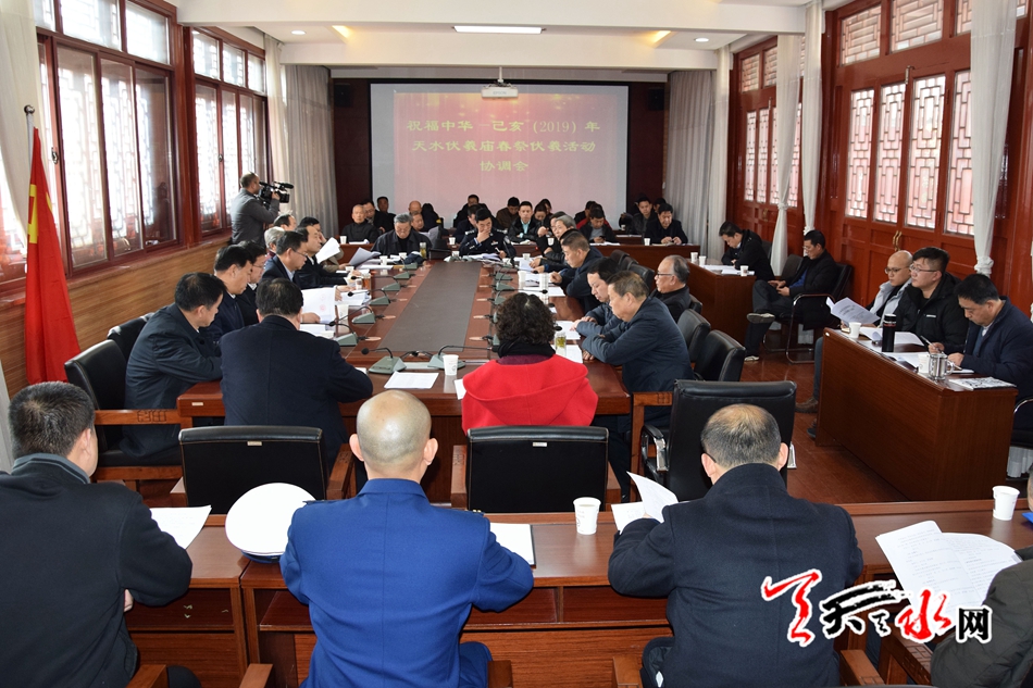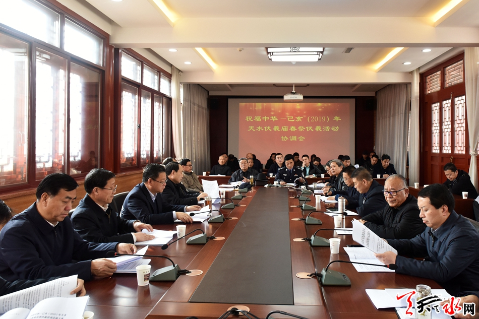 天天天水网讯【全媒体记者马哲】2月13日,己亥(2019)年伏羲庙春祭伏羲活动协调会在伏羲庙召开,市领导张建杰、安志宏、蒲朝晖、逯克宗、苏定武出席会议,市直相关部门及秦州区政府相关负责人参加会议。