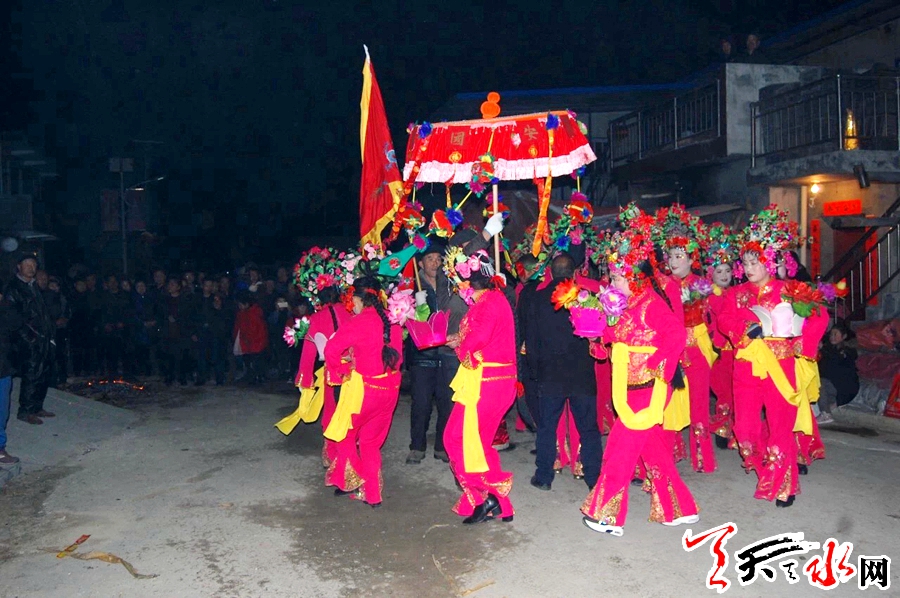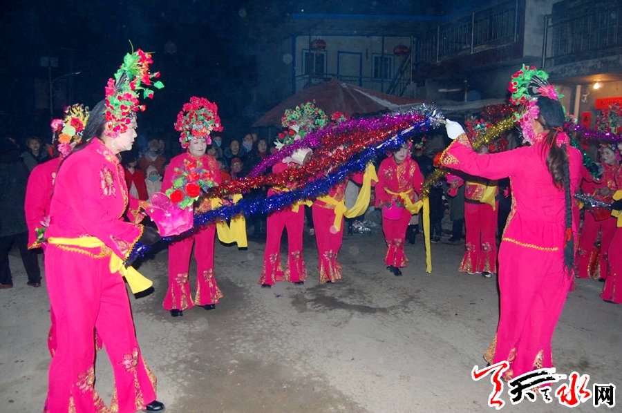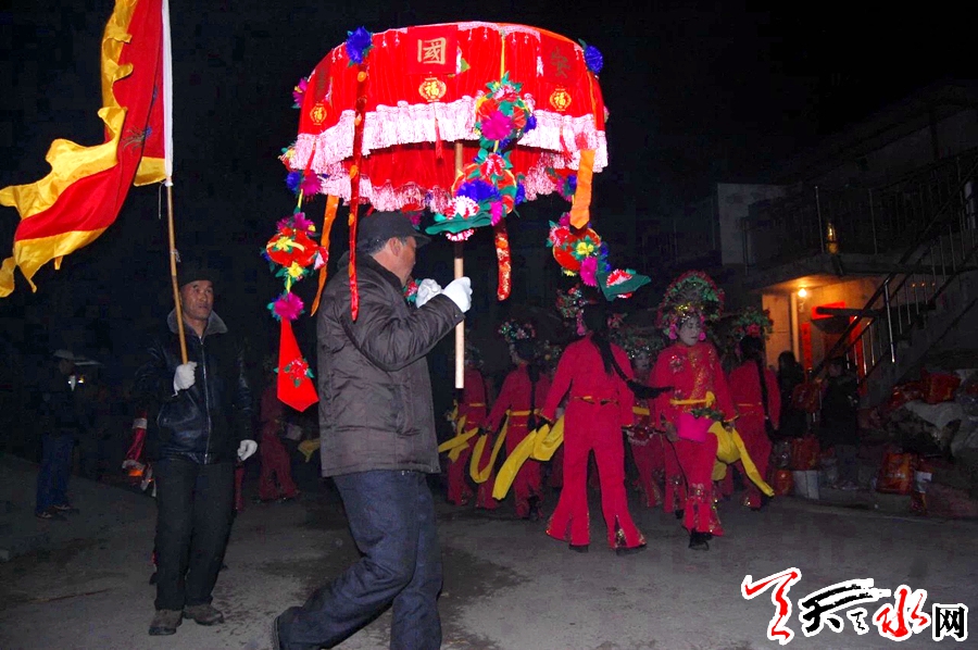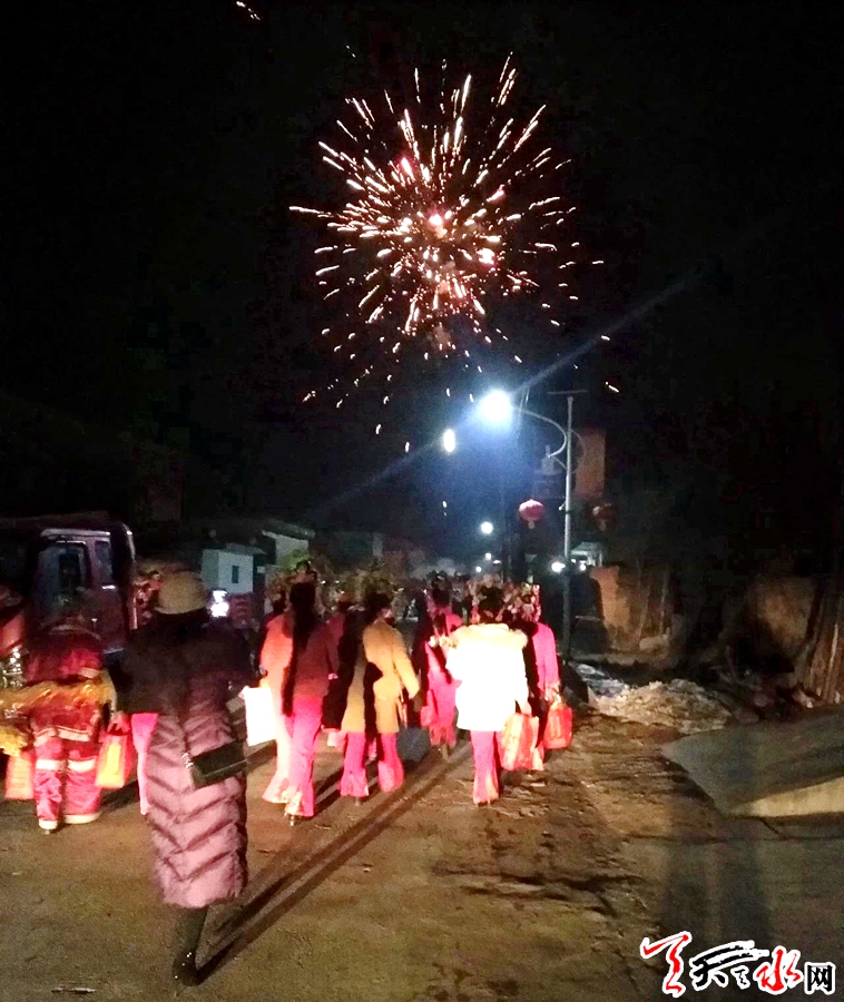 说话间,天已渐黑,门外响起的锣鼓声让原本平静的村庄开始热闹起来,村民扶老携幼闻声赶来,已收拾停当的社火队员们纷纷走出屋外。伴着天空不时绽放的烟花,踏着尚未消融的积雪,没走多久,浩浩荡荡的社火队便在一户何姓人家门前停了下来。