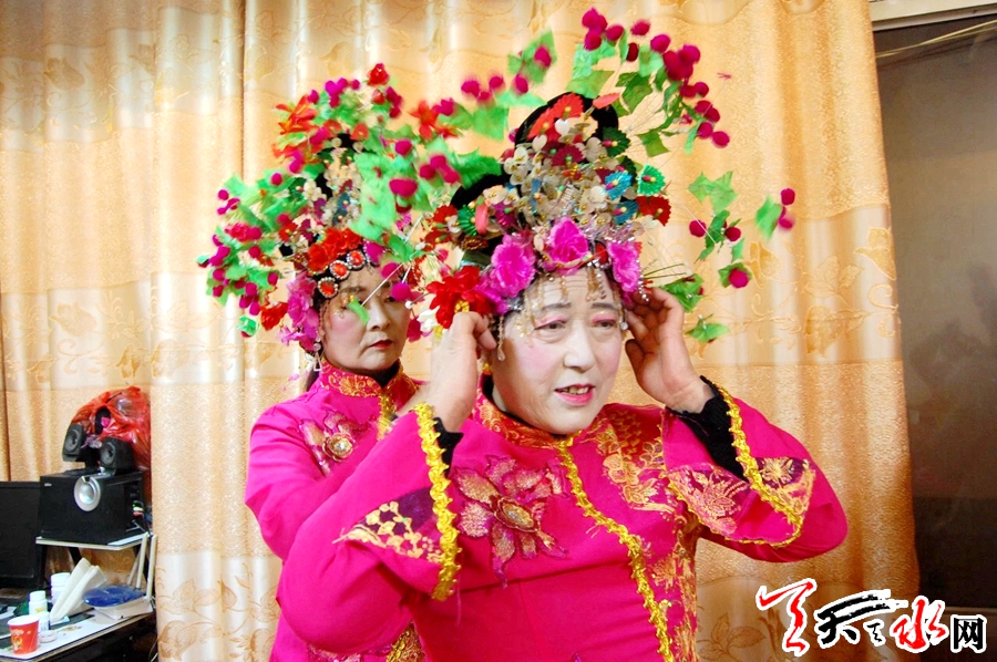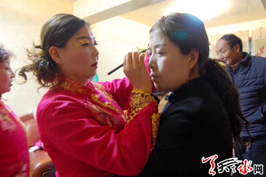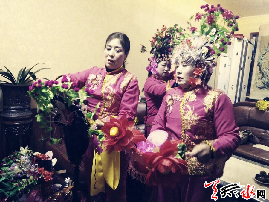 此刻,在团长范小红家,一场表演前的准备工作正在有序进行……对镜梳妆、佩戴头饰、穿着服装、整理道具,随着陆续而来的社火队员,已成为“化妆间”的宽敞客厅顿时显得拥挤起来。