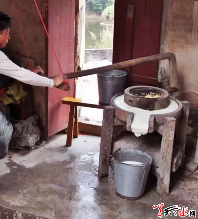 就这样,我家白天黑夜手磨不停地转,人来人往不断线。夜晚厨房灯火通明,白天上房茶炉不倒。那时乡村普遍贫穷,能做一榨豆腐(两竹萝)的人家很少,而单独做十几二十斤豆腐的工序和做一榨豆腐的工序一个样,少了划不来,犹如大马拉小车。所以,大都是两户、三户自找对象,合伙做一榨豆腐,就算是最好的年货了。由于合伙做豆腐来往的人较多,有干的、有等的,乡亲们抽烟品茶聊天,笑语连连。有时等的人还会上前帮忙推一会黄豆,或烧一锅开水。我们这些小孩子见院子人来人往的热闹场面,也来了兴趣,跳上窜下,手脚不闲,只觉得兴奋开心。