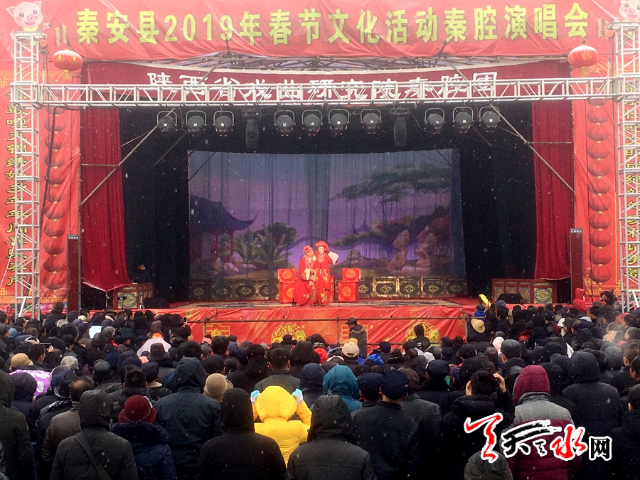 秦声豪迈辞旧岁,琴韵悠扬迎新春。2月17日(农历正月十三)秦安县兴国文化广场上人山人海,由秦安县委、县政府主办,县委宣传部、县文体广电和旅游局承办的秦安县2019年春节文化活动秦腔演唱会在这里继续开唱,虽然恰逢气温下降,天空中飘着雨夹雪,但是严寒的天气并没有阻挡住广大戏迷朋友们的热情,慕名观看演出的市民纷至沓来。