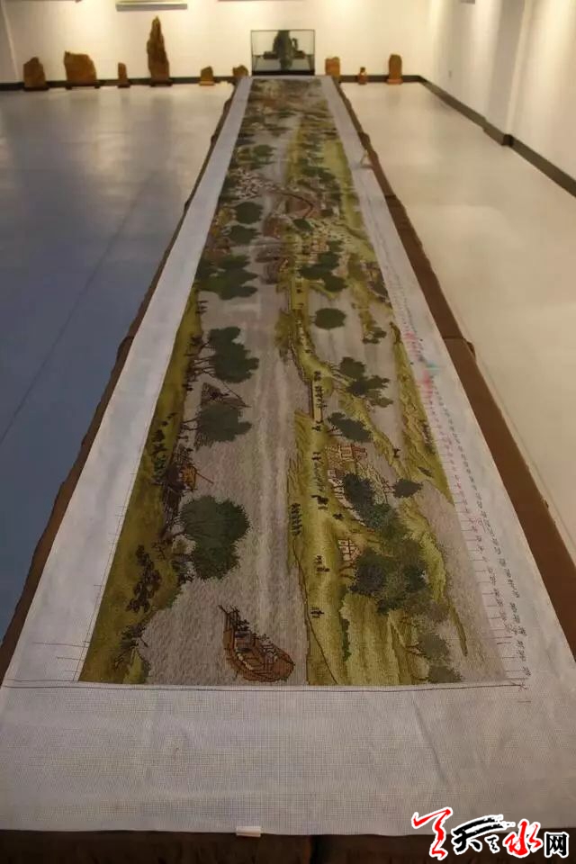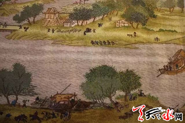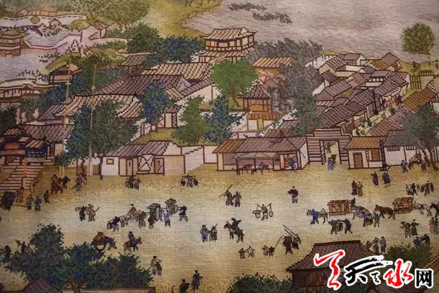 天天天水网讯 近日,武山县洛门镇农家女邓六妹花了8年时间用十字绣绣出了6米长卷“清明上河图”,这件作品近日在武山县博物馆文创展厅展出,该十字绣画卷长600cm(画芯部分560cm),宽74cm(画芯部分55cm),绣线和底布均为纯棉材质,共用了79种颜色的线,光样图就有124页。