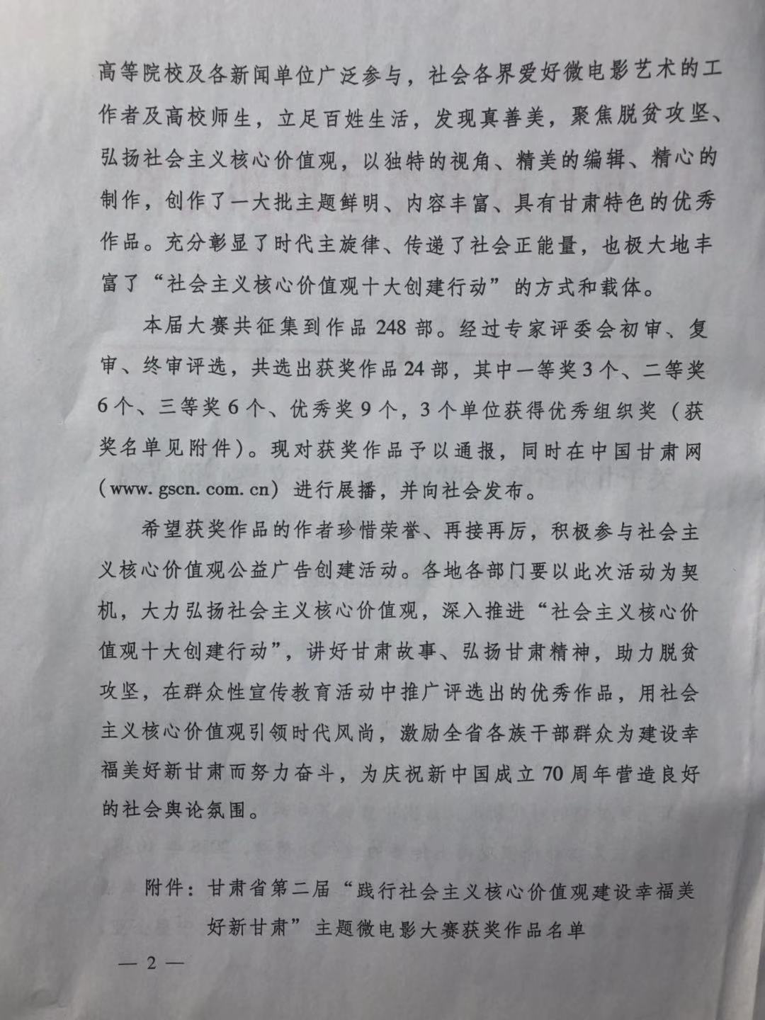 甘肃省第二届“践行社会主义核心价值观建设幸福美好新甘肃”主题微电影获奖作品名单