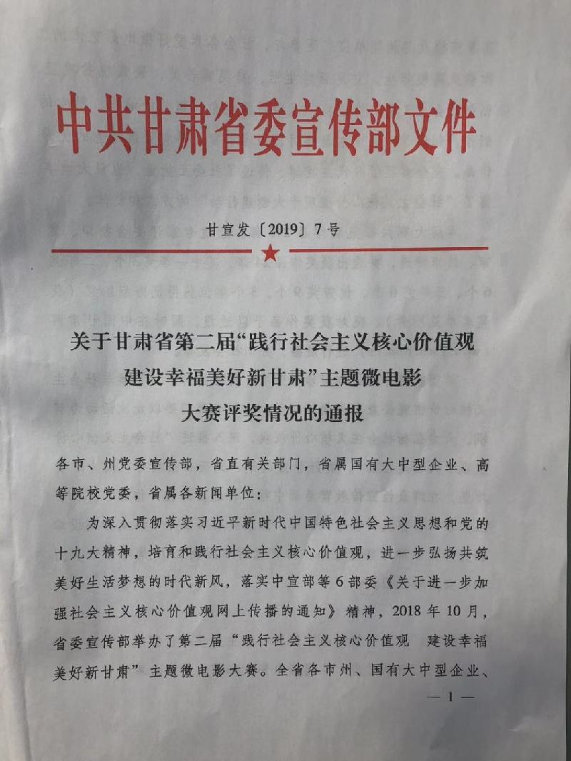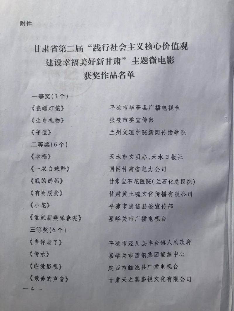天天天水网讯【记者 何永德】2月21日,甘肃省委宣传部举办的第二届“践行社会主义核心价值观 建设幸福美好新甘肃”主题微电影大赛评选揭晓,由市文明办出品,天水日报社、清水县委宣传部、清水县文明办联合摄制的微电影《幸福》在240多部作品中脱颖而出,荣获二等奖。