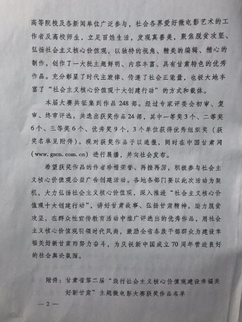 第二届“践行社会主义核心价值观 建设幸福美好新甘肃”主题微电影大赛自去年10月征集以来,共征集到来自全省各市州、国有大中型企业、高等院校及各新闻单位作品248部。经过专家评委会初审、复审、终审评选,共选出获奖作品24部,其中一等奖3个、二等奖6个、三等奖6个、优秀奖9个,3个单位获得优秀组织奖。