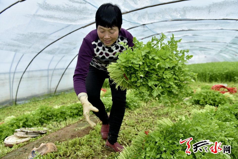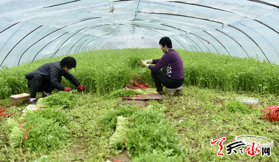 中午时分,记者来到了王随应家的芹菜大棚,一进大棚湿热的空气扑面而来,走在湿热的大棚里,不一会儿,记者便不自觉的摘下了围巾。遍地新鲜嫩绿的毛芹菜茂密繁盛。王随应正忙着收割芹菜,初春的季节里他额头冒着汗珠,当问到他怎么还不回家吃饭时,他笑呵呵地对记者说:“饭还顾上吃!现在割的芹菜都是客商定好的,今天必需把棚里的芹菜割完。”像他家这样的一个芹菜大棚,这个季节大概50多天割一茬,一茬能产800多公斤,一年七到八茬,现在收割的这一茬一个大棚的芹菜大概能卖4000元左右。