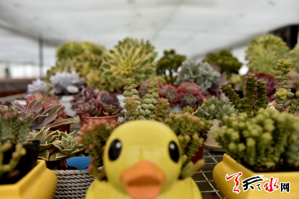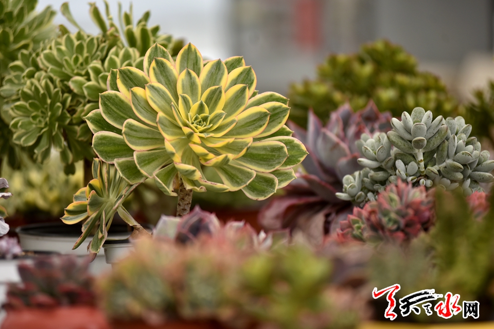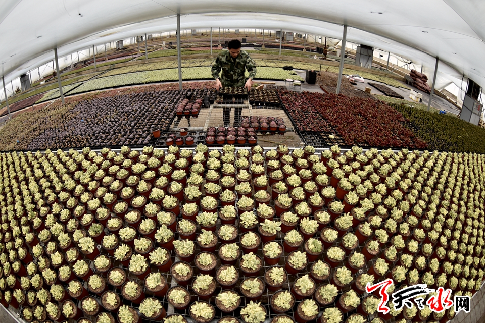 随后,记者又来到了新引进的甘谷多肉专业合作社,走进多肉大棚,那可真是赏心悦目,棚内春意盎然,完全感受不到初春的寒意。放眼一望,50万株成排成片的肉肉像集合的队伍一样,整整齐齐地种在方型塑料格子里。据甘谷多肉专业合作社负责人康志伟介绍,多肉大棚占地约9亩,他是2017年10月开始在甘谷试点种植多肉植物的,他手里有300多个品种,在甘谷种植有70多个品种,甘谷气候环境好十分适合多肉植物的种植生长,试点这一年来销售额达150多万元。
