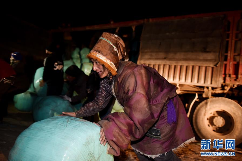 2月22日深夜,青海省玉树藏族自治州称多县扎朵镇治多村接到由爱心人士捐助的80吨牛羊饲草料。在当地干部和牧民的共同努力下,这批饲草料被及时卸下并发放给受灾牧民。 2018年年底至今,玉树州境内多次大范围降雪,部分地区遭受重度、特重度雪灾。截至目前,雪灾已影响玉树州28个乡镇99个村,受灾群众超过12万人,牲畜超100万头(匹),2万余头(匹)牲畜因灾死亡。近期,当地部分雪灾区或再度迎来降雪,灾情仍将持续。 新华社记者 吴刚 摄