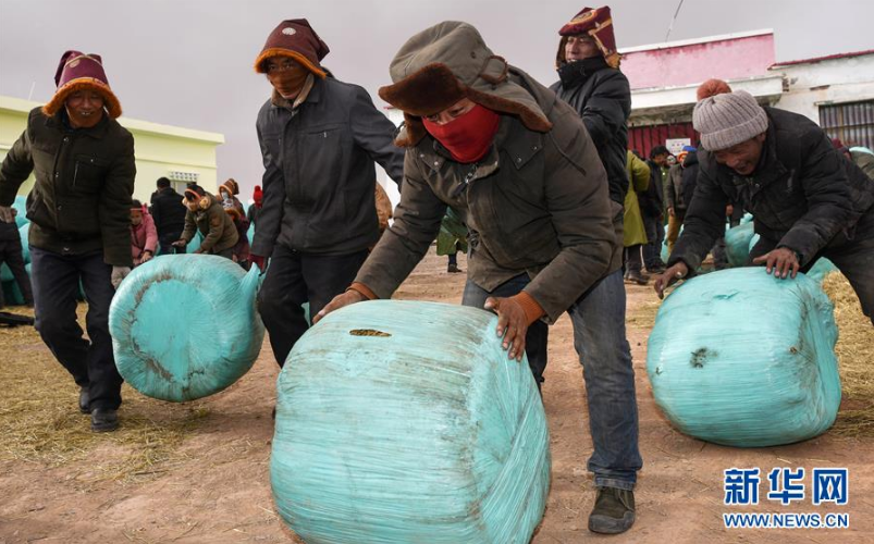 2月23日,在玉树州称多县扎朵镇治多村,牧民搬运领取的饲草料。新华社记者 吴刚 摄