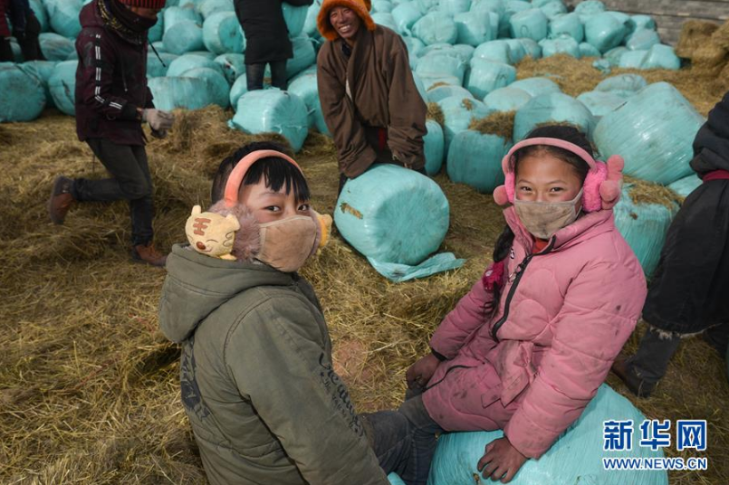 2月23日,在玉树州称多县扎朵镇治多村,两名小朋友坐在爱心人士捐助的饲草料上。新华社记者 吴刚 摄