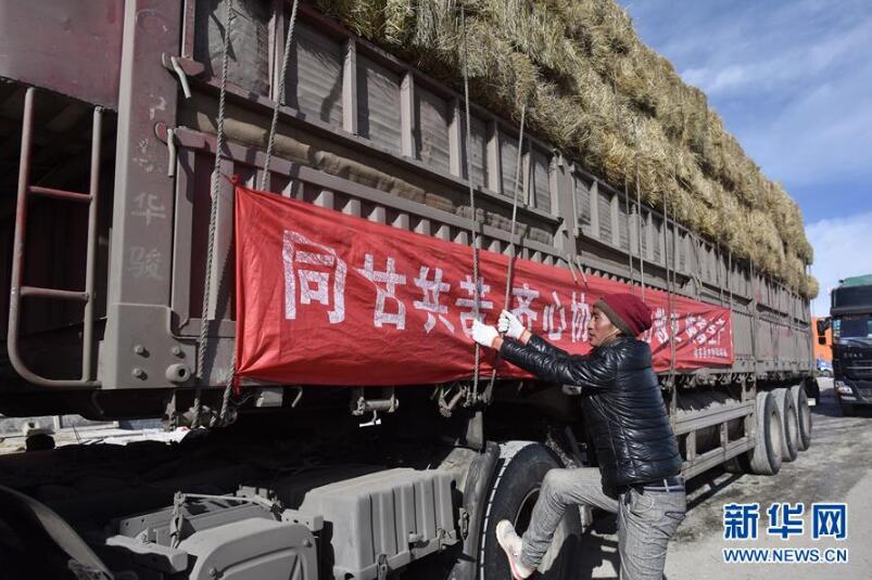 2月22日,在青海省玉树藏族自治州称多县清水河镇,一名司机在捆绑救灾饲草料。新华社记者吴刚摄