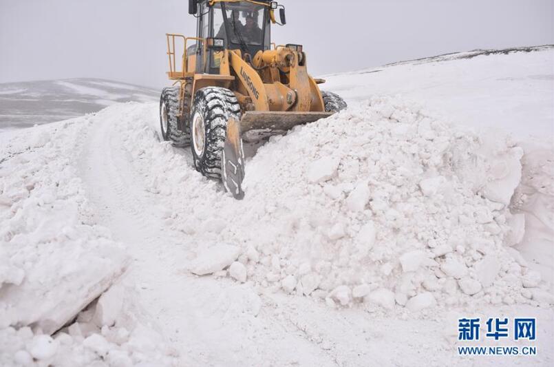 2月23日,在青海省玉树藏族自治州称多县扎朵镇治多村,一辆装载机在清除路面积雪。新华社记者吴刚摄