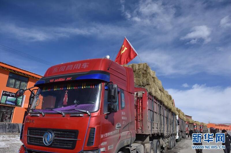 2月22日,在青海省玉树藏族自治州称多县清水河镇,几辆满载饲草料的救灾卡车整装待发。新华社记者吴刚摄