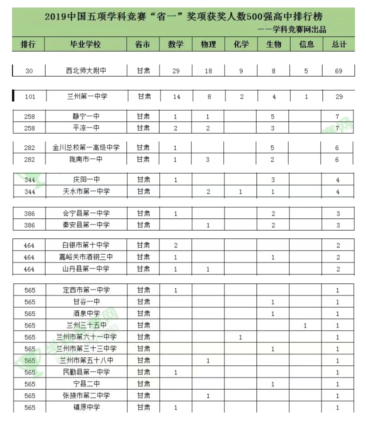 日前,学科竞赛网制作了《2019全国500强中学之五大学科竞赛“省一”排行榜》