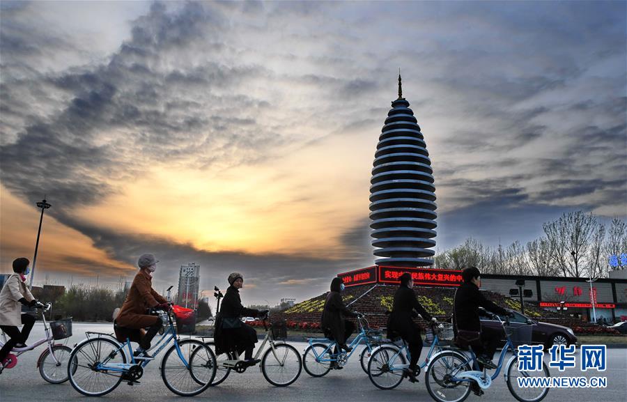 市民在河北雄安新区容城县县城道路上骑行(2018年3月29日摄)。新华社记者 牟宇摄