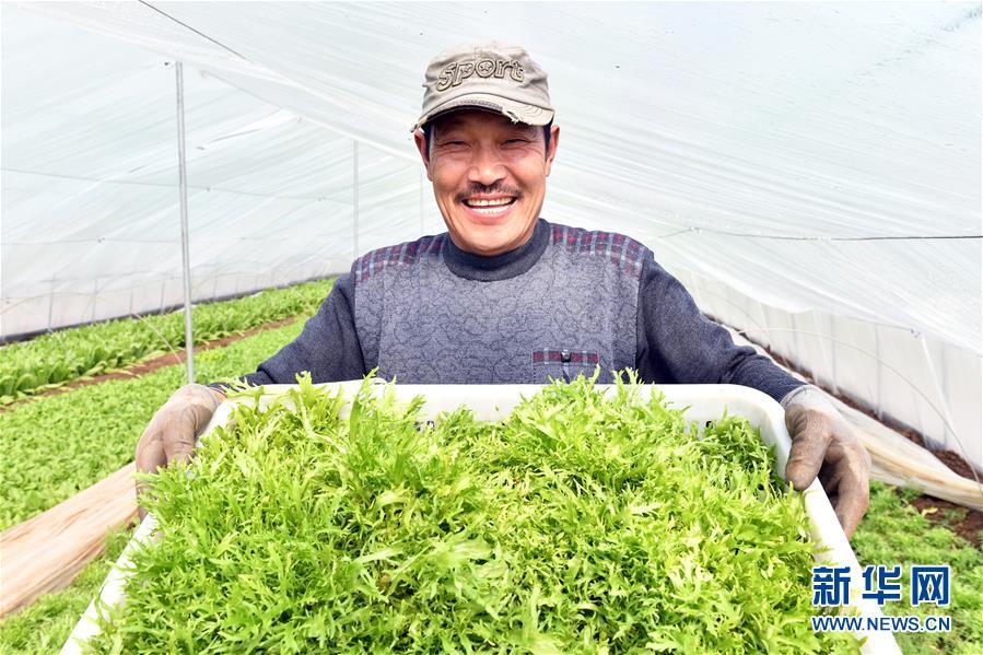 在山东潍坊市寒亭区中百大厨房的冯马杨孟村蔬菜种植基地,62岁的土地流转户冯佃岗在此打工,月收入三千多元(2月16日摄)。新华社记者 郭绪雷 摄