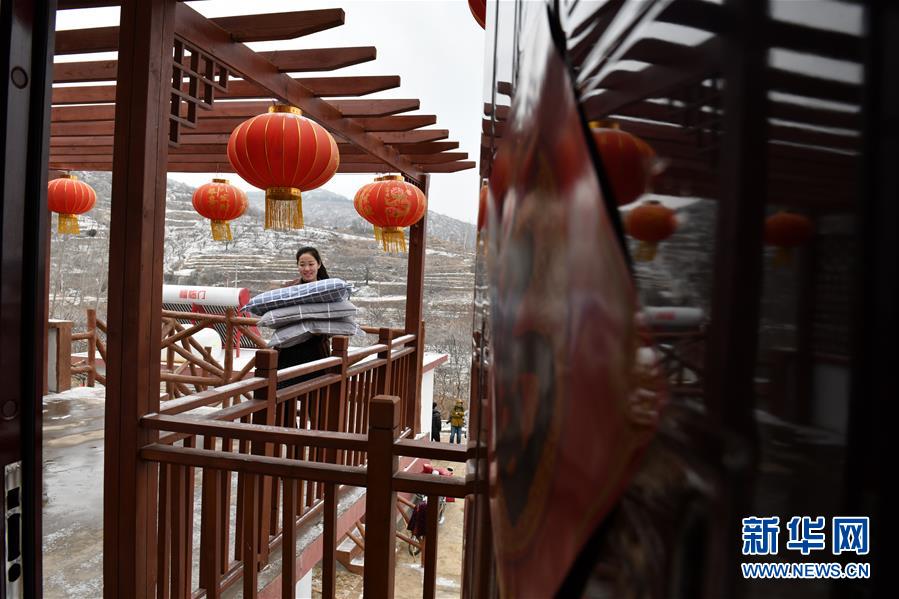 在山东临沂市蒙阴县樱之崮田园综合体,农家乐店主张彬抱着枕头准备整理客房(2月14日摄)。新华社记者 郭绪雷 摄