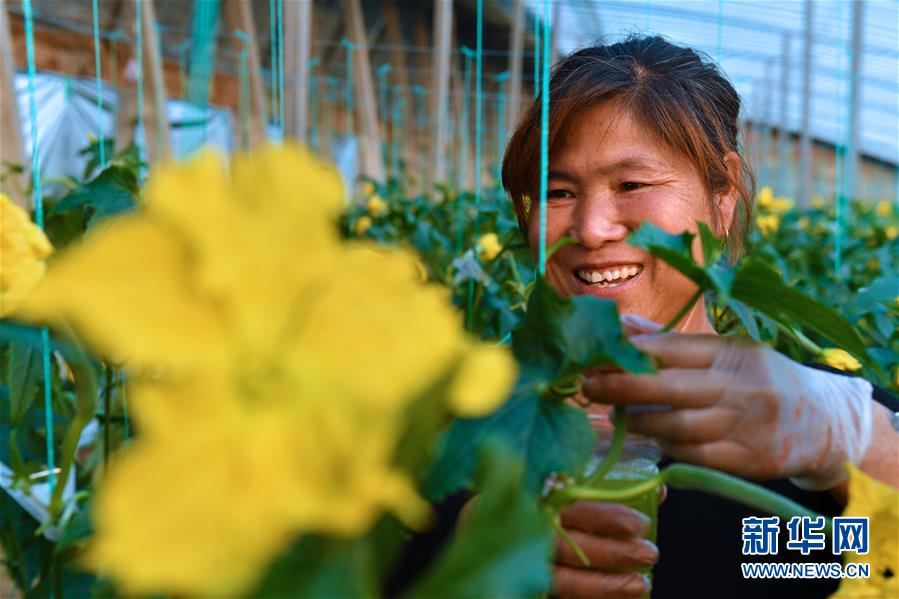 在山东寿光市纪台镇齐家村,菜农李向莲在蔬菜大棚给丝瓜人工授粉(1月25日摄)。新华社记者 郭绪雷 摄