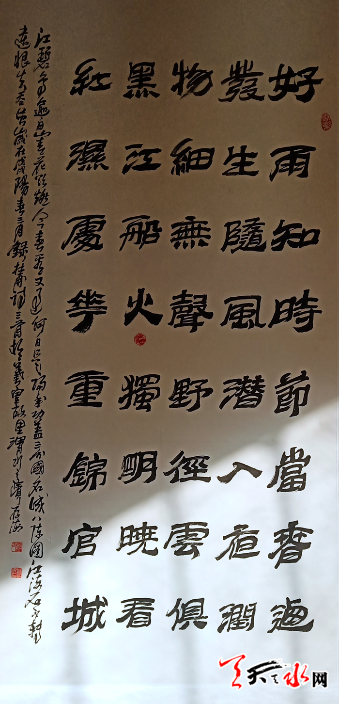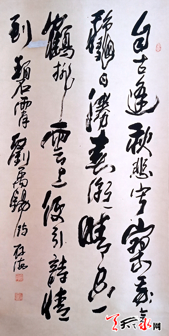 步入花甲之年的雷存海,在书画艺术创作上已孜孜以求走过几十年。先唐楷,后魏碑,再草书,临帖临碑无数,他的书法既有帖的书卷气,又有碑的金石气,气象浑厚,灵动自如,尤见功力。
