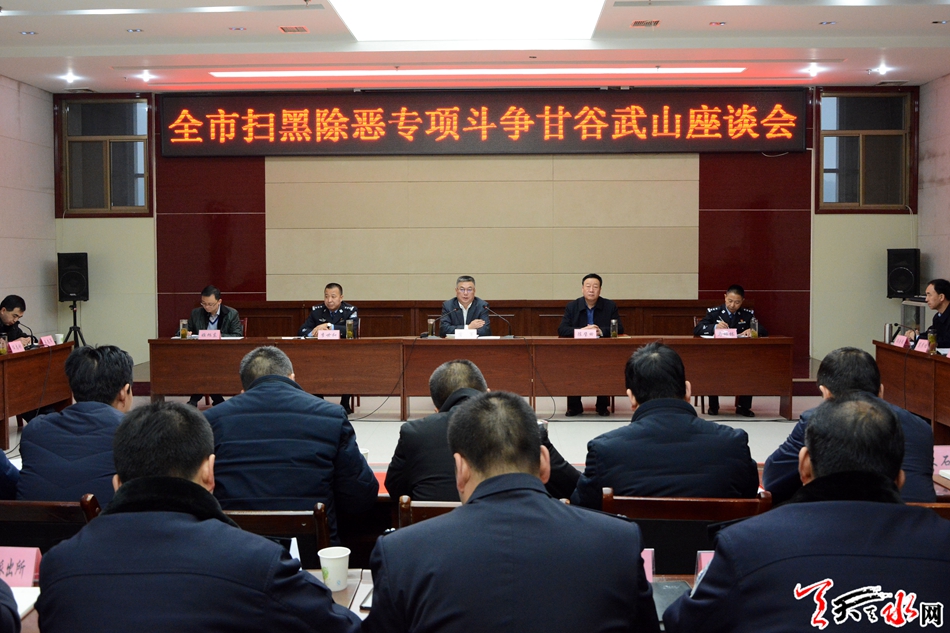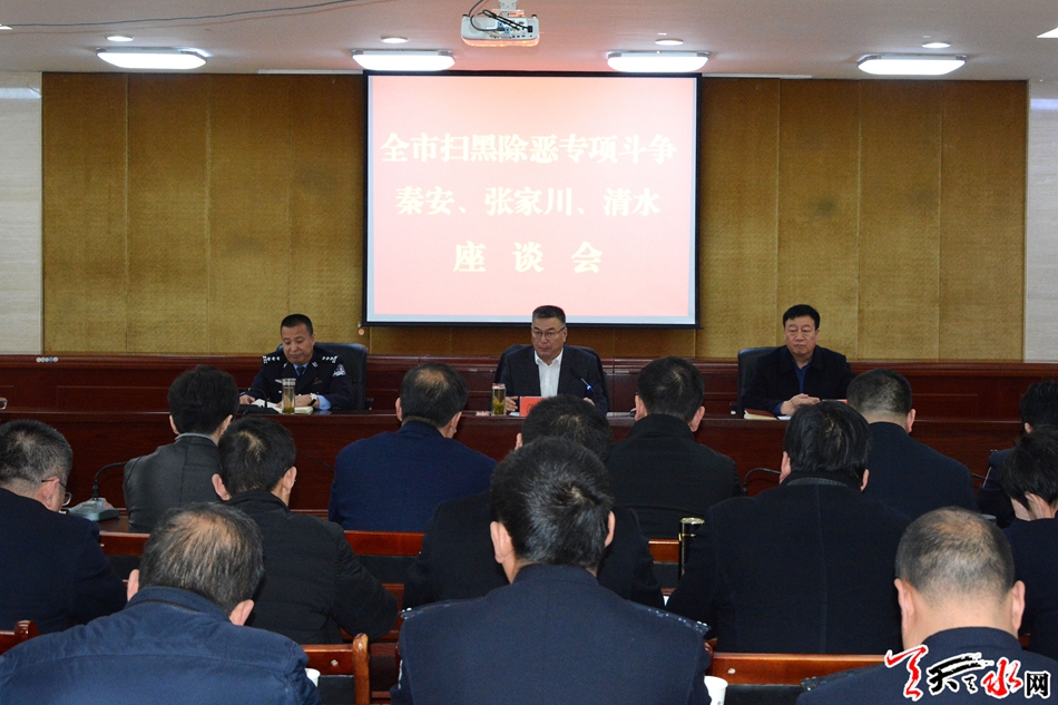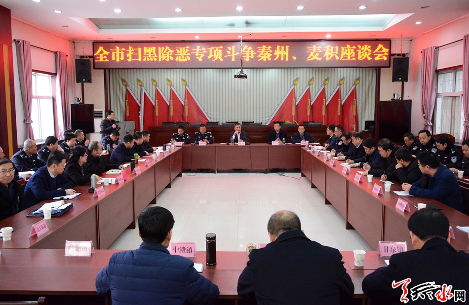座谈会分秦州、麦积片区,秦安、清水、张家川片区,甘谷、武山片区三个片区召开。各县区委政法委书记、公安(分)局局长及分管副局长、扫黑办主任、重点乡镇(街道)党(工)委书记、公安派出所所长160余人参加会议。