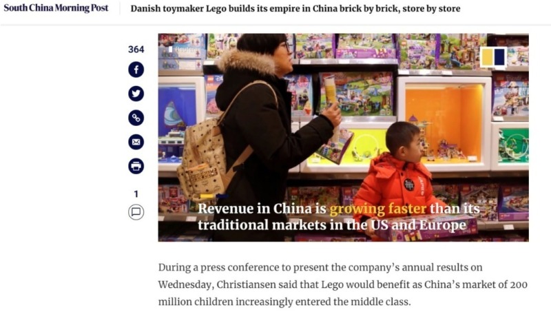 乐高2018年中国的收入增长达到了“强劲的两位数”。图片来源:《南华早报》报道截图
