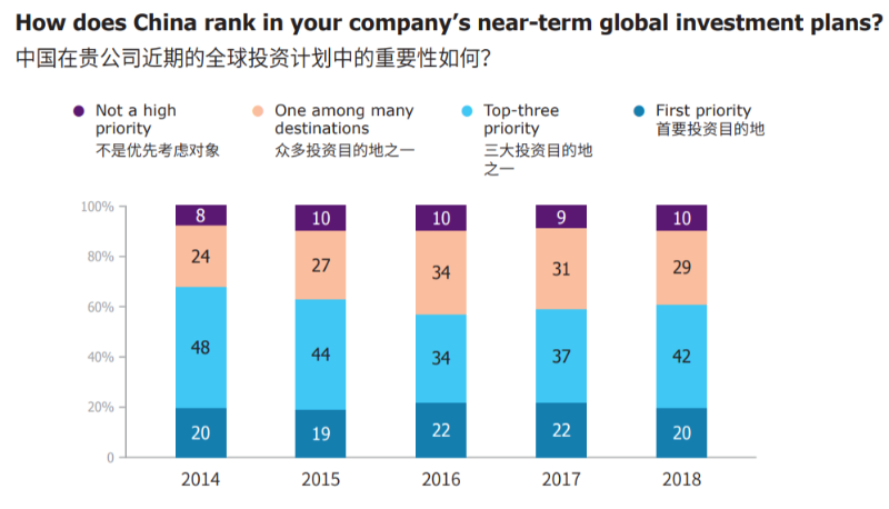 报告显示,自2015年以来,企业收入增长的趋势仍在继续。在受访企业中,69%的企业2018年实现了盈利,另外21%的企业实现了收支平衡。超过80%的会员企业预计2019年行业将实现正增长,会员企业明确表示中国仍然是所在行业近期全球投资计划的重中之重。