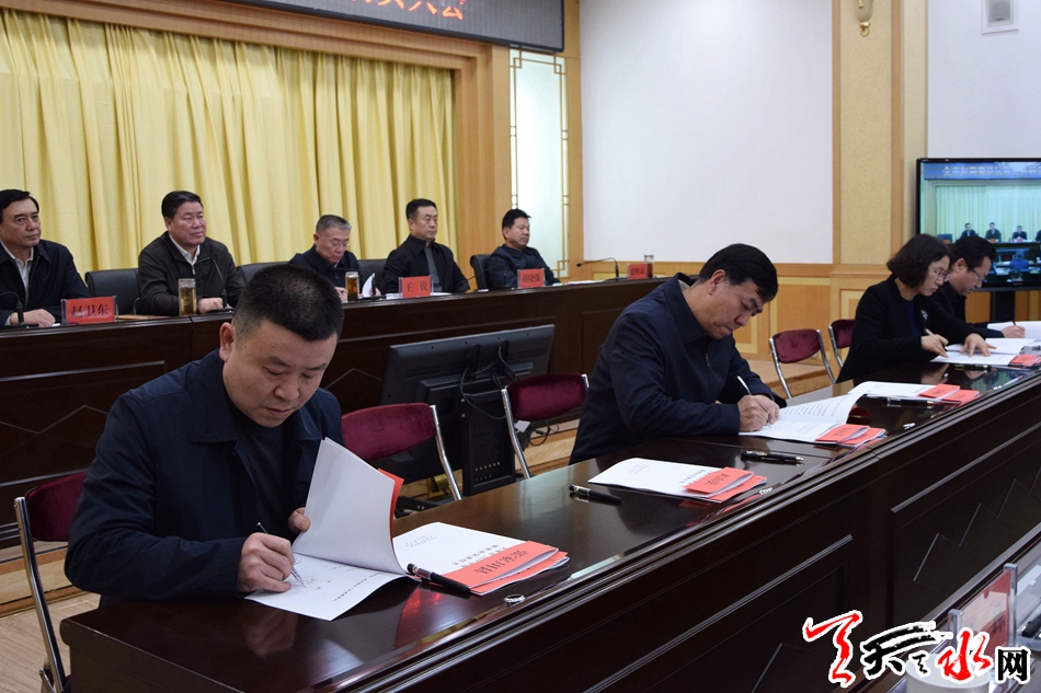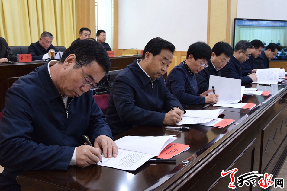 会上,市委市政府和10位市领导、7个县区、24个市直行业部门签订了2019年度脱贫攻坚责任书;4个市直部门、3个深度贫困县区、2个镇、3个村的负责同志作了表态发言。