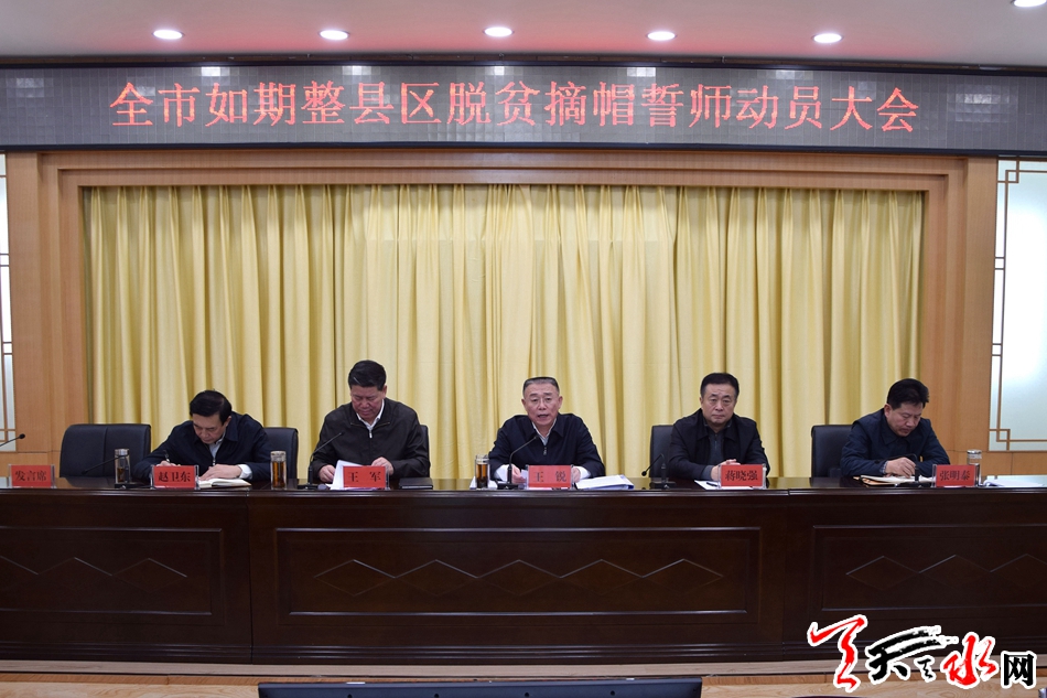 天天天水网讯【全媒体记者冯丽娟】3月4日,天水市委、市政府召开全市如期整县区脱贫摘帽誓师动员大会,市委书记王锐出席会议并讲话。他强调,全市上下要以只争朝夕的状态、敢死拼命的精神、志在必胜的决心,打赢打好脱贫攻坚这场硬仗,确保如期实现脱贫摘帽目标。