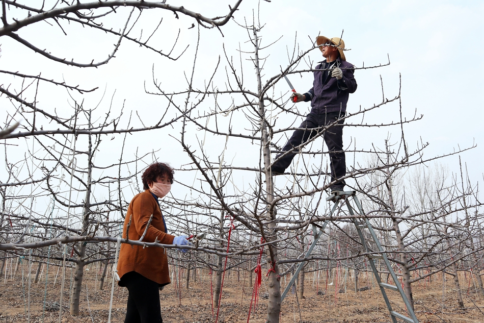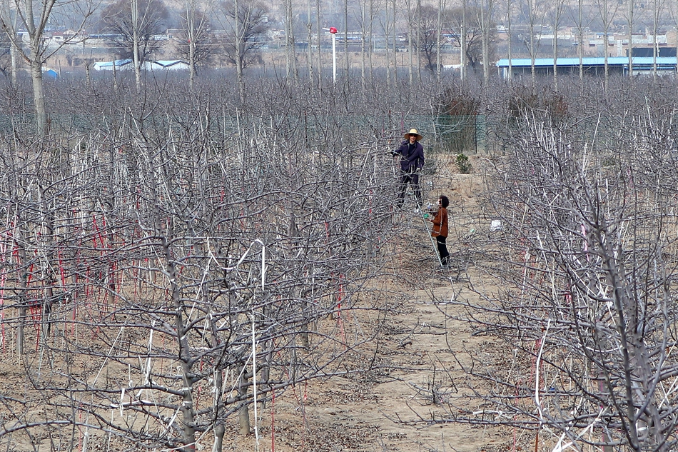 3月5日,甘谷县新兴镇坡下王村农民正在果园内修剪苹果树。随着近日气温逐渐回升,果园春季管理工作掀起热潮,果农们纷纷入园开展修剪拉枝、清园备肥和病虫害预防等各项工作,为今年丰产增收做好准备。 全媒体记者 周文涛 摄