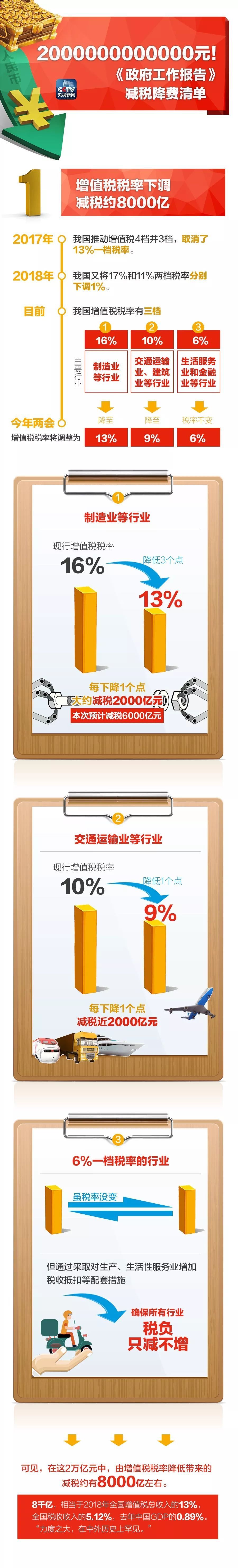 央视网消息:今年的政府工作报告指出,全年将减轻企业税收和社保缴费负担近2万亿元。这2万亿元主要将会降在哪里?哪些行业减税降费比较多?一张图告诉你。