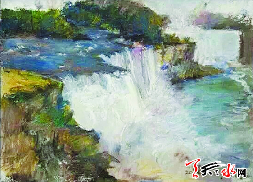 如今,音箱上的相框里,便是母女俩那次旅行留下的照片,而在抵达尼亚加拉大瀑布后,母女俩各自以水彩、油画棒写生的《尼亚加拉瀑布》作品,也被摆放在客厅中。