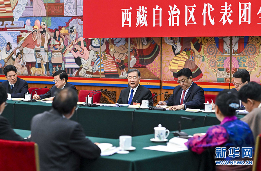 汪洋在西藏代表团参加审议。在听取普布顿珠、格桑卓嘎、扎西江村等代表发言后,汪洋表示,完全赞成栗战书委员长所作的全国人大常委会工作报告。汪洋充分肯定过去一年西藏各项事业发展成绩,指出西藏经济发展和社会稳定持续向好,但也要看到风险挑战。要深入学习贯彻习近平总书记关于西藏工作的重要论述,牢牢把握维护祖国统一、加强民族团结的着眼点和着力点,牢牢把握依法治藏、富民兴藏、长期建藏、凝聚人心、夯实基础的重要原则,居安思危、稳中求进,进一步巩固社会大局稳定好局面,进一步加强寺庙管理能力建设,进一步提高脱贫攻坚质量,确保雪域高原安定祥和、各族人民安居乐业。
